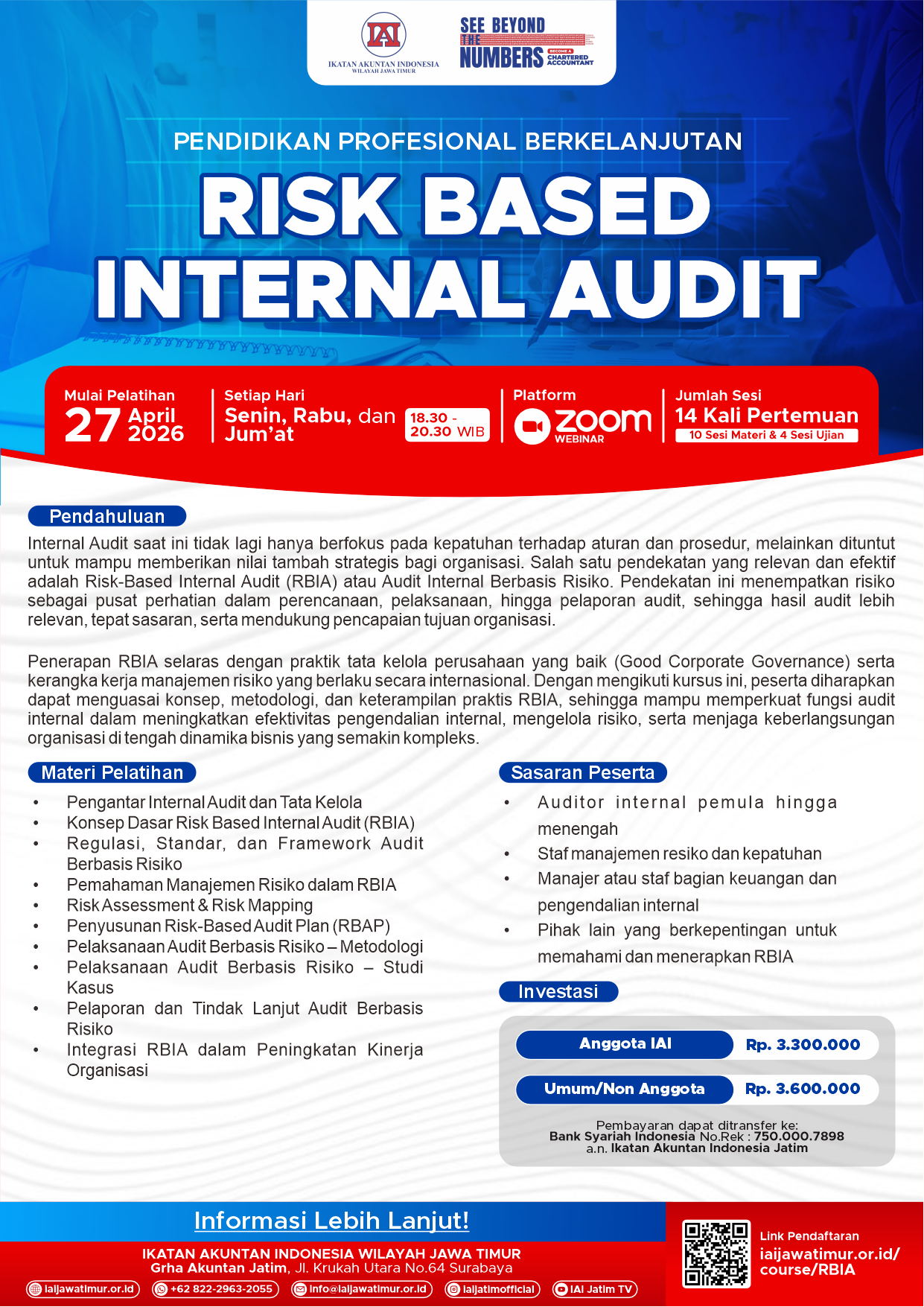 Penerapan RBIA selaras dengan praktik tata kelola perusahaan yang baik (Good Corporate Governance) serta kerangka kerja manajemen risiko yang berlaku secara internasional. Dengan mengikuti kursus ini, peserta diharapkan dapat menguasai konsep, metodologi, dan keterampilan praktis RBIA, sehingga mampu memperkuat fungsi audit internal dalam meningkatkan efektivitas pengendalian internal, mengelola risiko, serta menjaga keberlangsungan organisasi di tengah dinamika bisnis yang semakin kompleks.