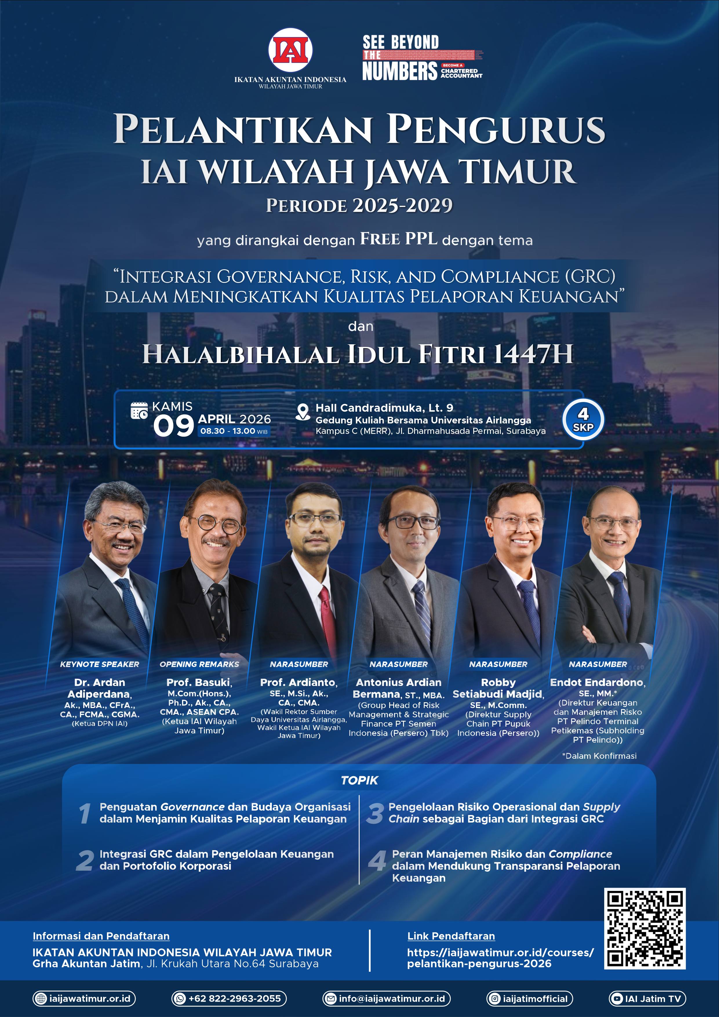 Pelantikan Pengurus IAI Wilayah Jawa Timur  Periode  2025  –  2029  yang  dirangkai  dengan  Free  PPL  dengan  tema  Integrasi Governance, Risk, and Compliance (GRC) dalam Meningkatkan Kualitas Pelaporan Keuangan dan Halalbihalal Idul Fitri 1447 H.