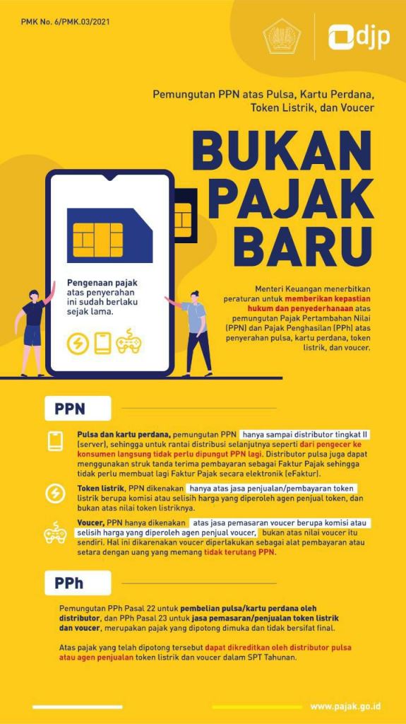 Pemerintah melalui Kementerian Keuangan (Kemenkeu) menerbitkan Peraturan Menteri Keuangan (PMK) No. 6/PMK.03/2021 tentang Perhitungan dan Pemungutan Pajak Pertambahan Nilai (PPN) serta Pajak Penghasilan atas Penyerahan atau Penghasilan sehubungan dengan Penjualan Pulsa, Kartu Perdana, Token, dan Voucher.