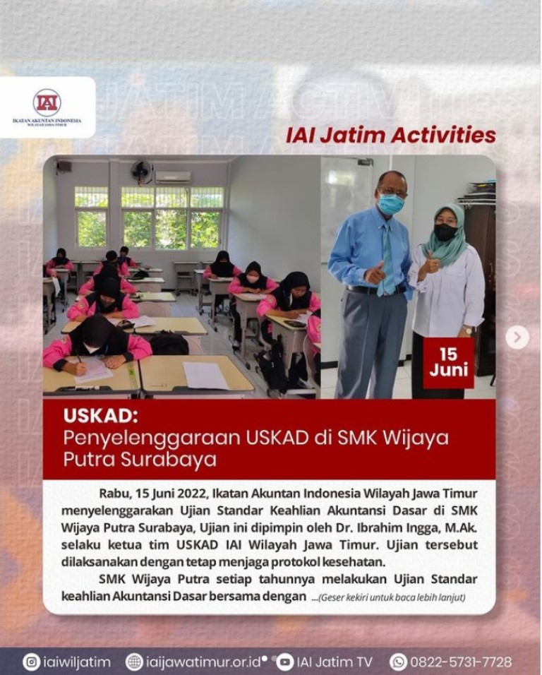 Rabu, 15 Juni 2022, Ikatan Akuntan Indonesia Wilayah Jawa Timur menyelenggarakan Ujian Standar Keahlian Akuntansi Dasar di SMK Wijaya Putra Surabaya, Ujian ini dipimpin oleh Dr. Ibrahim Ingga, M.Ak. selaku ketua tim USKAD IAI Wilayah Jawa Timur. Ujian tersebut dilaksanakan dengan tetap menjaga protokol kesehatan.