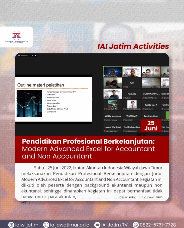 Sabtu, 25 Juni 2022, Ikatan Akuntan Indonesia Wilayah Jawa Timur melaksanakan Pendidikan Profesional Berkelanjutan dengan Judul Modern Advanced Excel for Accountant and Non Accountant, kegiatan ini diikuti oleh peserta dengan background akuntansi maupun non akuntansi, sehingga diharapkan kegiatan ini dapat bermanfaat tidak hanya untuk para akuntan namun juga untuk masyarakat pada umumnya. Kegiatan ini dibuka oleh oleh Drs. Danny Wibowo, Ak. MM., ACPA, BKP, CA, CFra, CLI, CMA, CPA. sebagai ketua bidang Akuntan Kantor Jasa Akuntan Ikatan Akuntan Indonesia Wilayah Jawa Timur