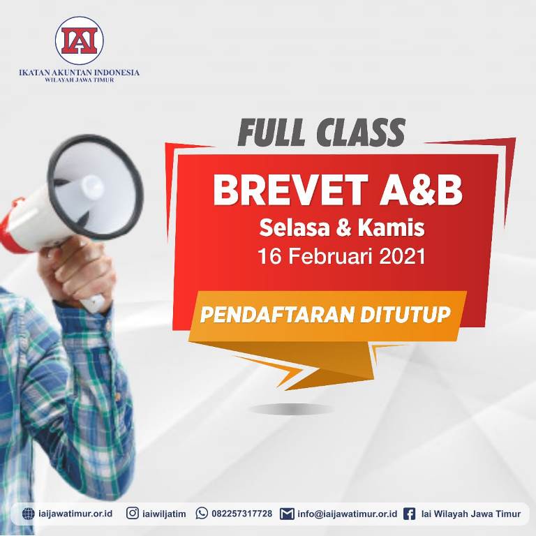 Pendaftaran pelatihan Brevet A dan B Selasa dan Kamis di IAI Wilayah Jawa Timur yang akan dilaksanakan 16 Februari 2021 telah ditutup , Bagi para calon peserta Brevet A dan B yang ingin mendaftar, kami masih membuka pendaftaran untuk pelatihan Brevet A dan B Sabtu Minggu 20 Februari 2021. Ingin mendaftar atau melihat pelatihan reguler yang akan dilaksanakan di IAI Wlayah Jawa Timur? Silahkan klik link berikut : http://bit.ly/pelatihan_reguler