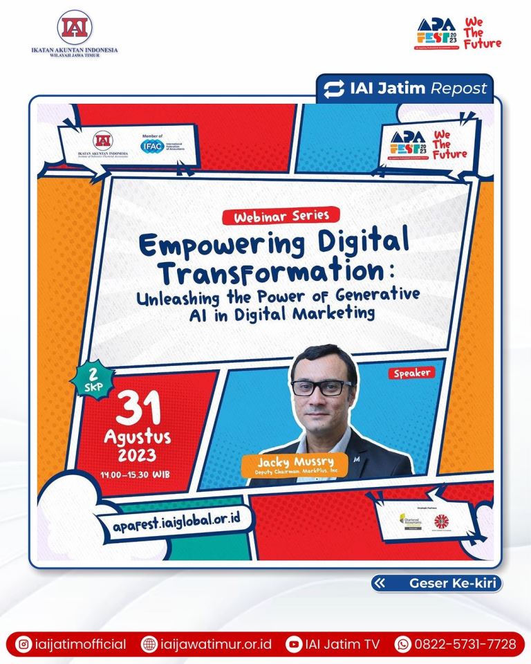 IAI mengundang Bapak Jacky Mussry, Deputy Chairman Markplus, Inc, untuk melakukan sharing mengenai digital marketing dalam webinar pertama APA Fest 2023 yang berjudul “Empowering Digital Transformation: Unleashing the Power of Generative AI in Digital Marketing" dan akan diselenggarakan pada: