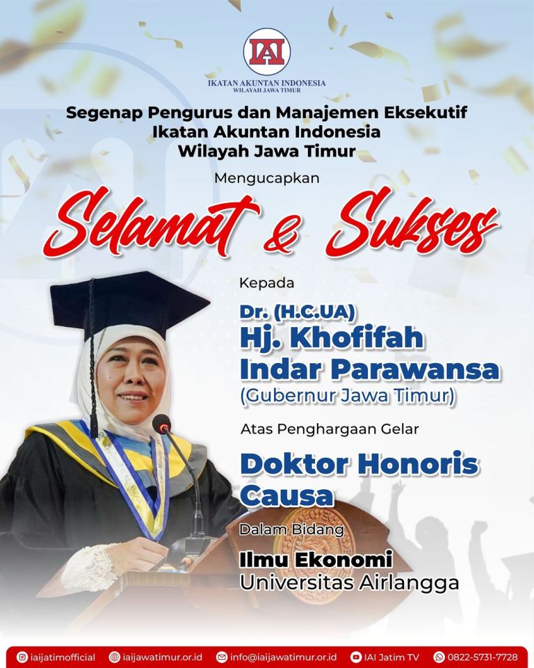 Segenap Pengurus dan Manajemen Eksekutif Ikatan Akuntan Indonesia Wilayah Jawa Timur Mengucapkan Selamat dan Sukses Kepada Dr. (H.C.UA) Hj. Khofifah Indar Parawansa (Gubernur Jawa Timur) Atas Penghargaan Gelar Doktor Honoris Causa Dalam Bidang Ilmu Ekonomi Universitas Airlangga.