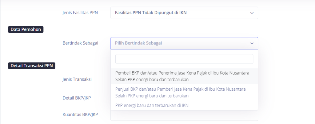 Selain itu, pemerintah juga memberikan fasilitas Pajak Pertambahan Nilai (PPN) untuk barang dan jasa tertentu di Ibu Kota Nusantara (IKN). Berdasarkan Pasal 156 ayat (1) huruf a dan b PMK 28/2024, fasilitas PPN yang diberikan mencakup PPN Tidak Dipungut untuk penyerahan BKP dan JKP strategis tertentu serta impor BKP strategis tertentu. Fasilitas ini dapat dimanfaatkan melalui Surat Keterangan Tidak Dipungut (SKTD). Setelah sistem memvalidasi syarat, wajib pajak perlu melengkapi data pemohon. Pemohon dapat bertindak sebagai pembeli BKP, penerima JKP, penjual BKP, pemberi JKP, atau khusus sebagai PKP yang bergerak di sektor energi baru dan terbarukan di IKN.